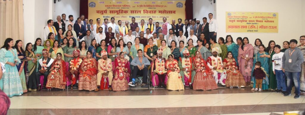 ਭਾਰਤ ਵਿਕਾਸ ਪ੍ਰੀਸ਼ਦ, ਮਹਾਰਿਸ਼ੀ ਦਯਾਨੰਦ ਸ਼ਾਖਾ ਅੰਬਾਲਾ ਸ਼ਹਿਰ ਅਤੇ ਡਾ. ਪੁਨੀਤ ਰਾਜ ਮੈਮੋਰੀਅਲ ਚੈਰੀਟੇਬਲ ਟਰੱਸਟ ਨੇ ਸ਼ਹਿਰ ਦੇ ਸੈਕਟਰ 9 ਸਥਿਤ ਅਗਰਵਾਲ ਭਵਨ ਵਿੱਚ ਚੌਥਾ ਸਮੂਹਿਕ ਸਾਦਾ ਵਿਆਹ ਉਤਸਵ ਆਯੋਜਿਤ ਕੀਤਾ ਜਿਸ ਵਿੱਚ ਸਾਬਕਾ ਮੰਤਰੀ ਅਸੀਮ ਗੋਇਲ ਨੇ ਮੁੱਖ ਮਹਿਮਾਨ ਵਜੋਂ, ਭਾਵਿਪ ਹਰਿਆਣਾ ਉੱਤਰੀ ਦੇ ਪ੍ਰਧਾਨ ਧੀਰਜ ਭਾਟੀਆ ਨੇ ਪ੍ਰੋਗਰਾਮ ਪ੍ਰਧਾਨ ਵਜੋਂ, ਯੋਗੀ ਦਿਨੇਸ਼ ਕਾਂਤ ਜਿੰਦਲ ਨੇ ਵਿਸ਼ੇਸ਼ ਮਹਿਮਾਨ ਵਜੋਂ, ਸੂਬਾਈ ਸਰਪ੍ਰਸਤ ਅਨੁਜ ਅਗਰਵਾਲ, ਮਨੋਹਰ ਲਾਲ ਸਚਦੇਵਾ, ਮੁਕੇਸ਼ ਸਿੰਘਲ, ਵਿਨੋਦ ਵੈਸ਼ ਅਤੇ ਸੂਬਾਈ ਸਕੱਤਰ ਕਪਿਲ ਗੁਪਤਾ ਨੇ ਲਾੜਿਆਂ ਤੇ ਲਾੜੀਆਂ ਨੂੰ ਆਪਣਾ ਆਸ਼ੀਰਵਾਦ ਦਿੱਤਾ। ਸ਼ਾਖਾ ਦੇ ਸਰਪ੍ਰਸਤ ਪ੍ਰਦੀਪ ਗੋਇਲ, ਸਹਿ-ਸਰਪ੍ਰਸਤ ਦੀਪਕ ਰਾਏ ਅਨੰਦ ਅਤੇ ਵਿਵੇਕ ਗੁਪਤਾ, ਪ੍ਰਧਾਨ ਅਜੈ ਅਗਰਵਾਲ, ਸਕੱਤਰ ਰਾਕੇਸ਼ ਮੱਕੜ, ਵਿੱਤ ਸਕੱਤਰ ਮਨੋਜ ਗਰਗ, ਪ੍ਰੋਜੈਕਟ ਮੁਖੀ ਚਮਨ ਅਗਰਵਾਲ ਅਤੇ ਮਹਿਲਾ ਭਾਗੀਦਾਰੀ ਮੁਖੀ ਰਚਨਾ ਗੁਪਤਾ ਦੀ ਅਗਵਾਈ ਹੇਠ ਛੇ ਜੋੜਿਆਂ ਦੇ ਸਮੂਹਿਕ ਰੂਪ ਵਿਚ ਹਿੰਦੂ ਰੀਤੀ-ਰਿਵਾਜਾਂ ਅਨੁਸਾਰ ਵਿਆਹ ਕੀਤੇ ਗਏ। ਆਯੋਜਕਾਂ ਵੱਲੋਂ ਹਰੇਕ ਜੋੜੇ ਨੂੰ ਘਰੇਲੂ ਜ਼ਰੂਰਤਾਂ ਦਾ ਸਮਾਨ ਦਿੱਤਾ ਗਿਆ। ਇਸ ਸਮੂਹਿਕ ਵਿਆਹ ਆਯੋਜਨ ਵਿੱਚ ਸ਼ਾਖਾ ਦੇ 80 ਵਿੱਚੋਂ 65 ਮੈਂਬਰਾਂ ਨੇ ਆਪਣੇ ਪਰਿਵਾਰਾਂ ਸਮੇਤ ਜ਼ਿੰਮੇਵਾਰੀਆਂ ਨੂੰ ਵਧੀਆ ਢੰਗ ਨਾਲ ਨਿਭਾਇਆ। ਸ਼ਾਖਾ ਦੇ ਸਹਿ-ਸਰਪ੍ਰਸਤ ਅਤੇ ਖੇਤਰੀ ਸਕੱਤਰ ਦੀਪਕ ਰਾਏ ਅਨੰਦ ਨੇ ਦੱਸਿਆ ਕਿ ਸ਼ਾਖਾ ਹੁਣ ਤੱਕ 46 ਲੜਕੀਆਂ ਦੇ ਵਿਆਹ ਦੀ ਸਹੂਲਤ ਪ੍ਰਦਾਨ ਕਰ ਚੁੱਕੀ ਹੈ ਅਤੇ ਭਵਿੱਖ ਵਿੱਚ ਵੀ ਅਜਿਹੇ ਸਮਾਗਮਾਂ ਦਾ ਆਯੋਜਨ ਕਰਦੀ ਰਹੇਗੀ।